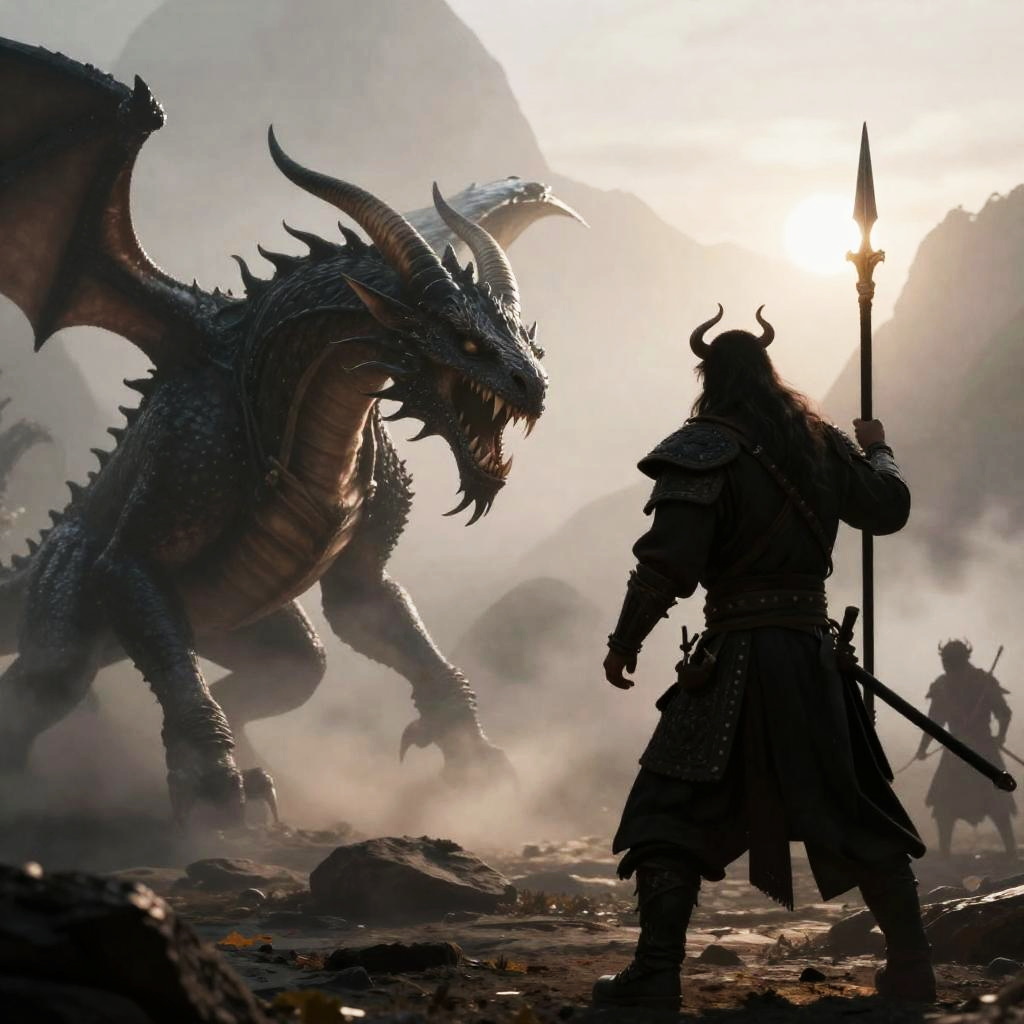 A dark, horned, dragon-like creature with long tendrils and sharp teeth on the left, facing a silhouetted warrior with horns, wielding a long spear, in a smoky, mountainous battlefield. The warrior stands ready, sunlight behind. Two figures, rocky ground, intense battle.