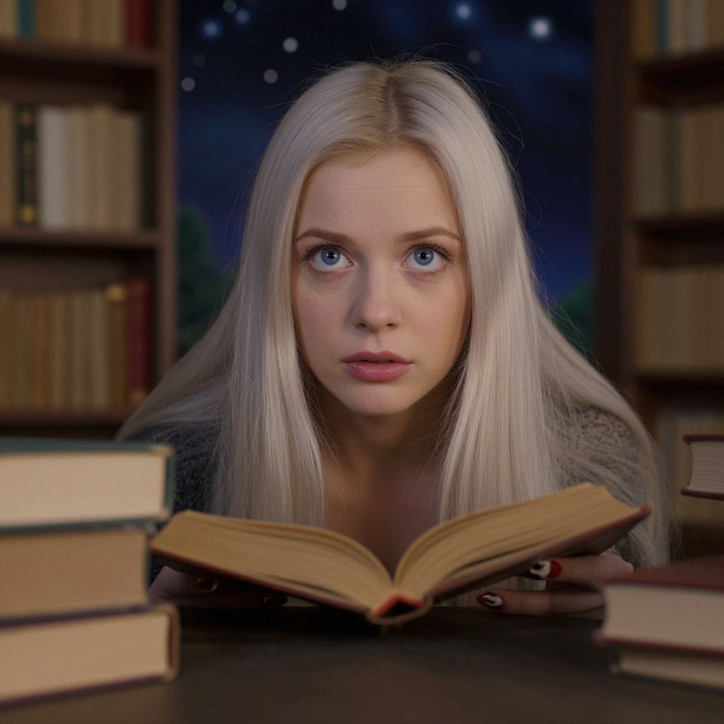 Photograph of a young woman with long, straight platinum blonde hair and blue eyes, leaning over an open book on a wooden table in a dimly lit library. She has fair skin and a slightly surprised expression. The background features tall bookshelves filled with books and a window showing a starry night sky. Several stacked books are visible on the table in the foreground, adding depth to the scene. The image has a soft, slightly magical quality, emphasizing her wide-eyed, attentive look.