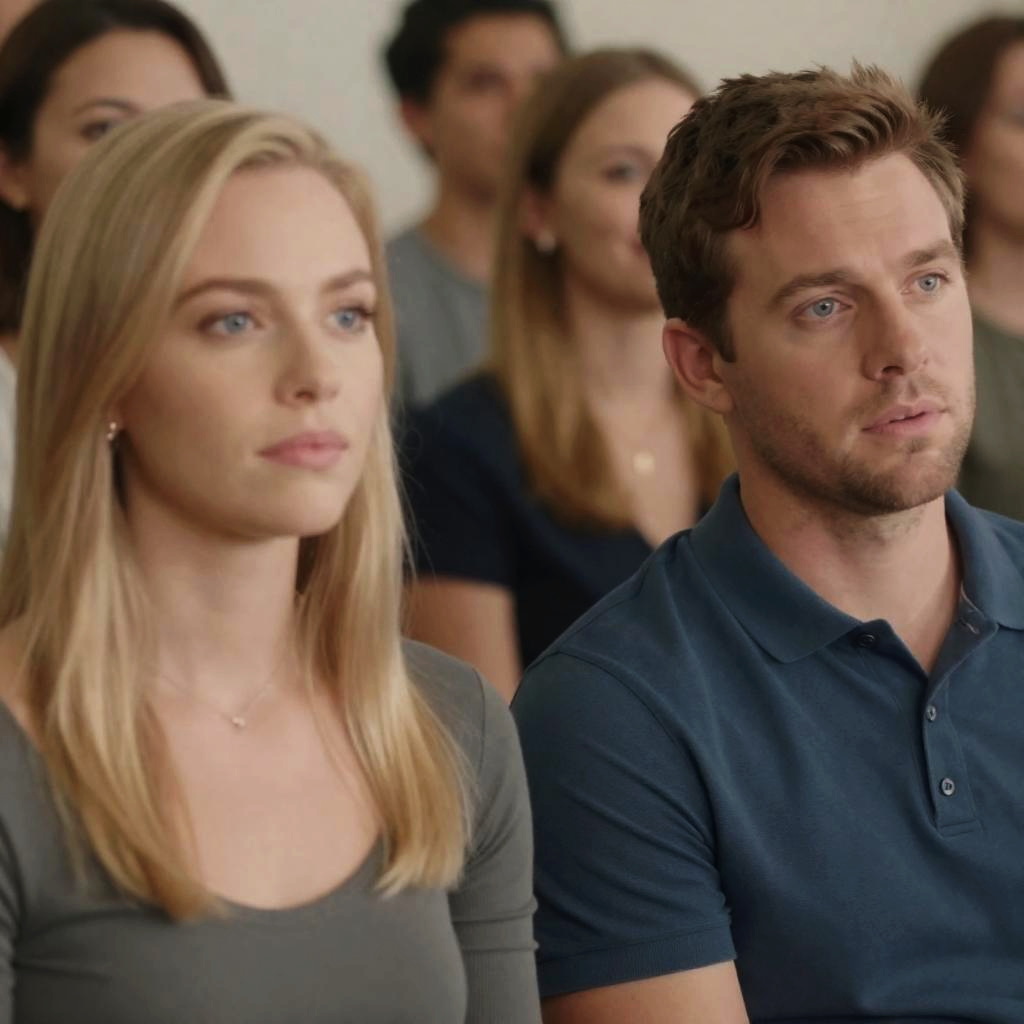 Photograph of a serious-looking man and woman in a crowded indoor setting, featuring the woman with blonde hair, wearing a black hat and red dress, and the man with short brown hair in a white shirt. The woman has her hand on the man's shoulder, with blurred people, some wearing hats, in the dimly lit background.