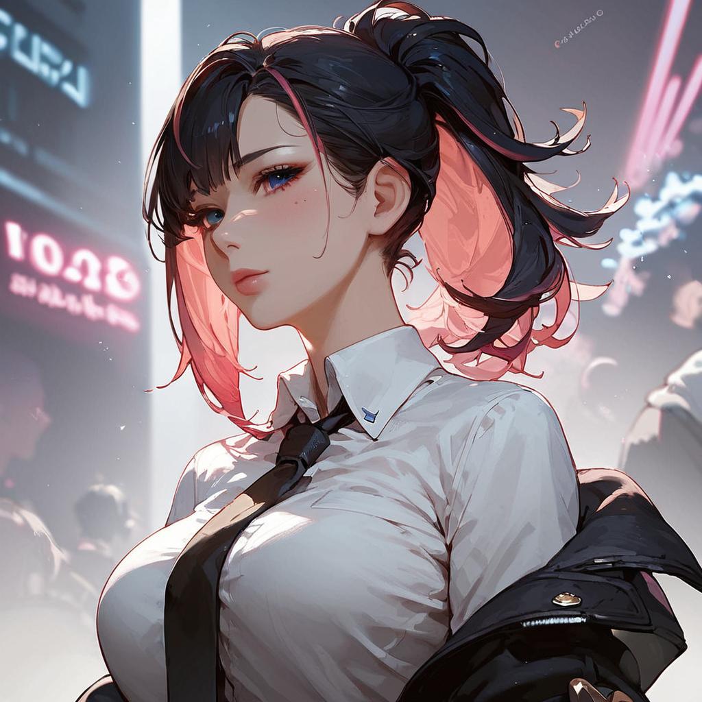 A woman posing on the street corner with black blazer on and white shirt on, best quality, 1girl, huge breast, day, bright, blur background, bokeh, outdoor, (street:0.8), (people, crowds:0.8), (black blazer, white shirt, white blouse:1.5), gorgeous, (long hair:1.2), (floating hair:1.2), beautiful detailed sky, (dynamic pose:1), soft lighting, wind, shiny skin, (portrait:1)