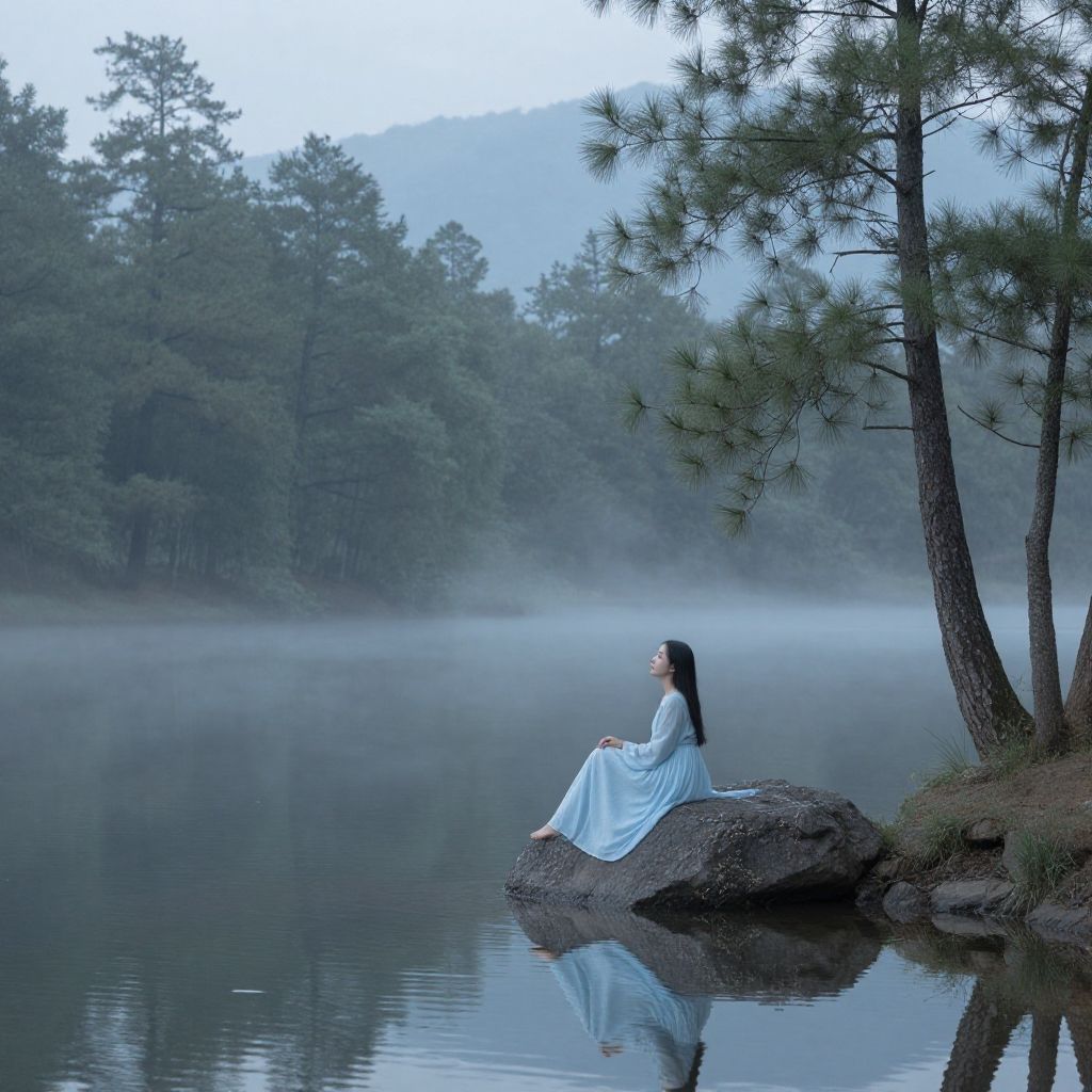 A serene image of a lone woman in a flowing light blue dress sitting on a rock by a calm, reflective lake surrounded by misty pine trees. The soft, muted blue tones and diffused lighting create an ethereal, dreamlike atmosphere in a tranquil forest setting. The background features gentle fog and mountains, enhancing the peaceful and introspective mood of the scene.