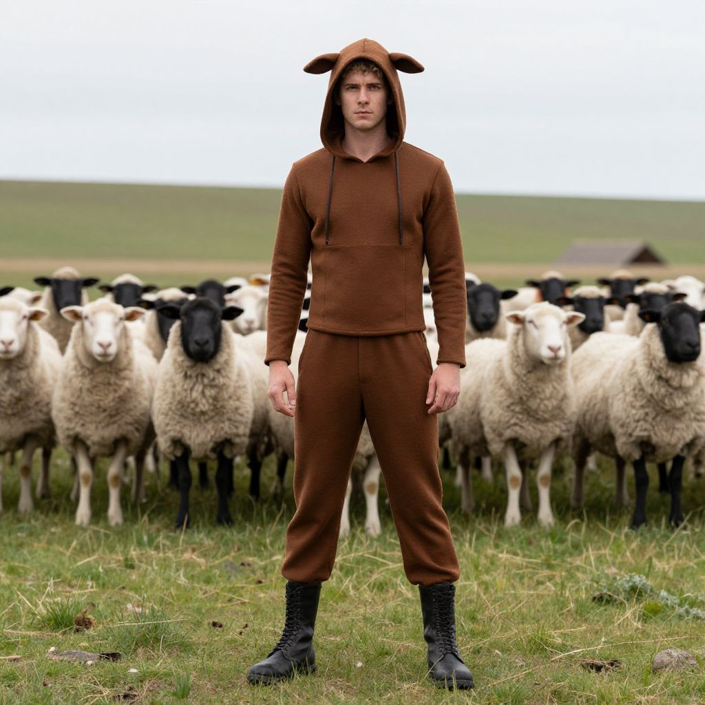 Shepherd Costume Adult, man in brown outfit standing in front of a herd of sheep