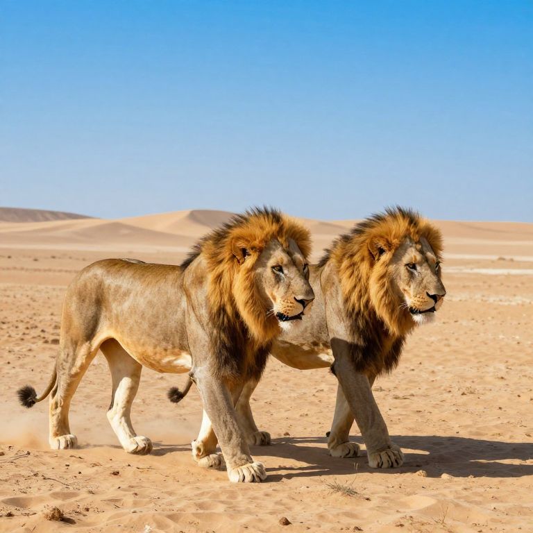 Two majestic lions stride side by side across a vast desert landscape, their golden manes contrasting against the sandy terrain as they survey their domain under a clear blue sky.