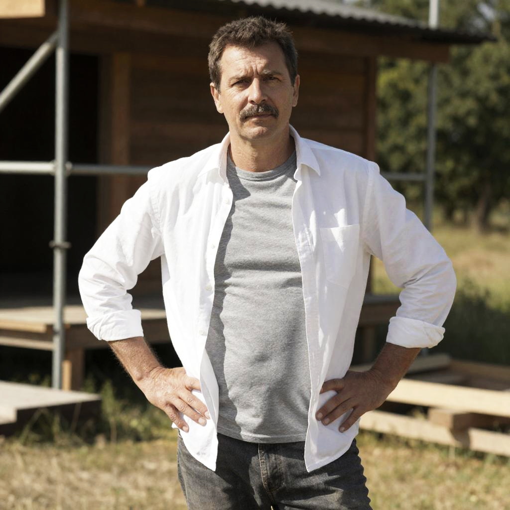 Photograph of a middle-aged man with short brown hair and a slight mustache, standing outdoors with hands on hips. He wears a white, partially unbuttoned shirt over a gray t-shirt and faded pants. Background includes a wooden structure with scaffolding, trees, and dry grass. Sunlight casts shadows. Man has a serious expression. Grass in foreground, wooden items scattered behind structure.