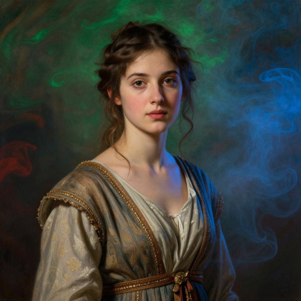 A detailed portrait of a young woman in an ancient outfit, surrounded by green and blue smoke, with soft red and blue lights, reminiscent of paintings by William Bouguereau, Alma Tadema, and Singer Sargent.