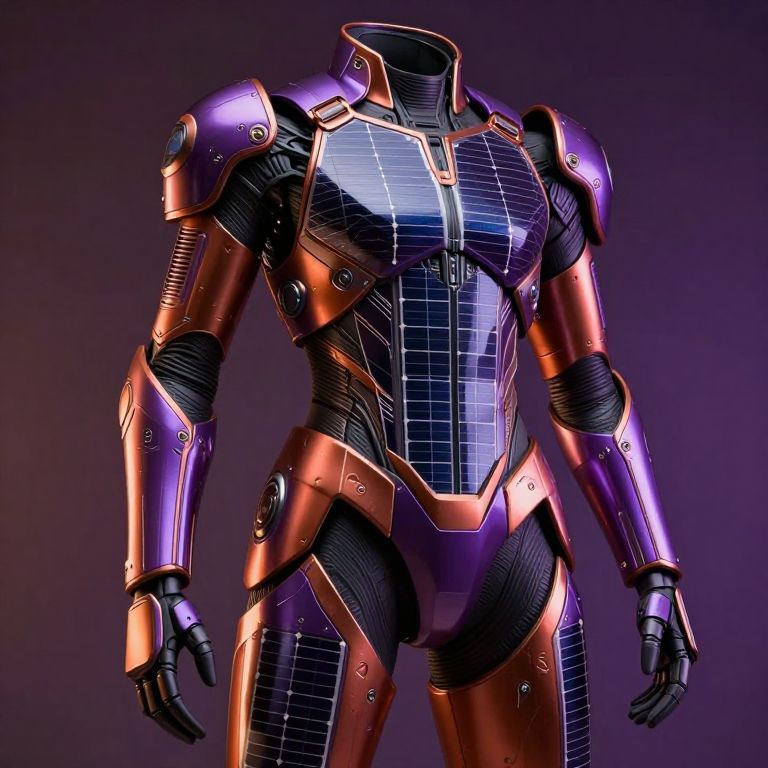 A person in sleek, futuristic armor made from solar panels, featuring a purple and copper color scheme with a sci-fi aesthetic, stands in dramatic product photography with volumetric lighting and rich colors.