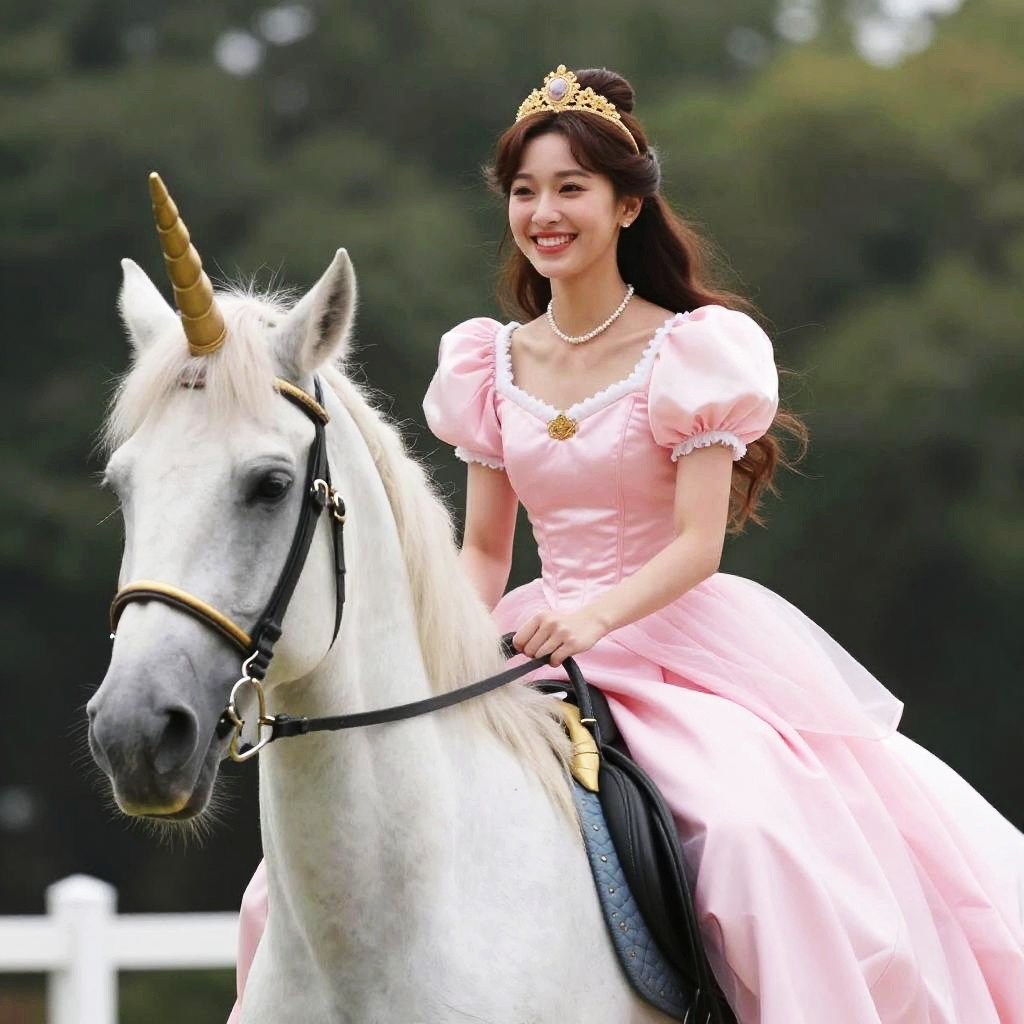 Photograph of an Asian woman with long, wavy black hair, wearing a pink, puffed-sleeve, ballgown-style princess dress with a gold brooch at the neckline, and a gold tiara. She is smiling and sitting gracefully on a white unicorn with a golden horn, black bridle, and grey muzzle. The background is blurred with green trees and a white fence. The woman's skin is fair, and she wears a pearl necklace. The image has a vibrant, fairytale-like quality, emphasizing the princess and unicorn theme.