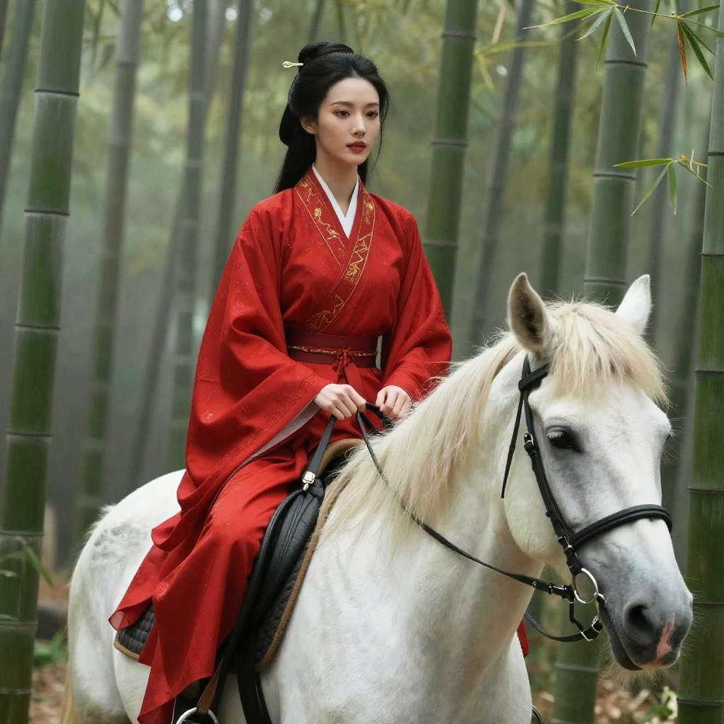A woman dressed as a princess in a pink gown with puffed sleeves rides a white horse adorned with a unicorn horn and golden bridle, creating a whimsical and playful cosplay scene. She smiles happily as she enjoys the outdoor setting, blending fantasy elements with candid charm.