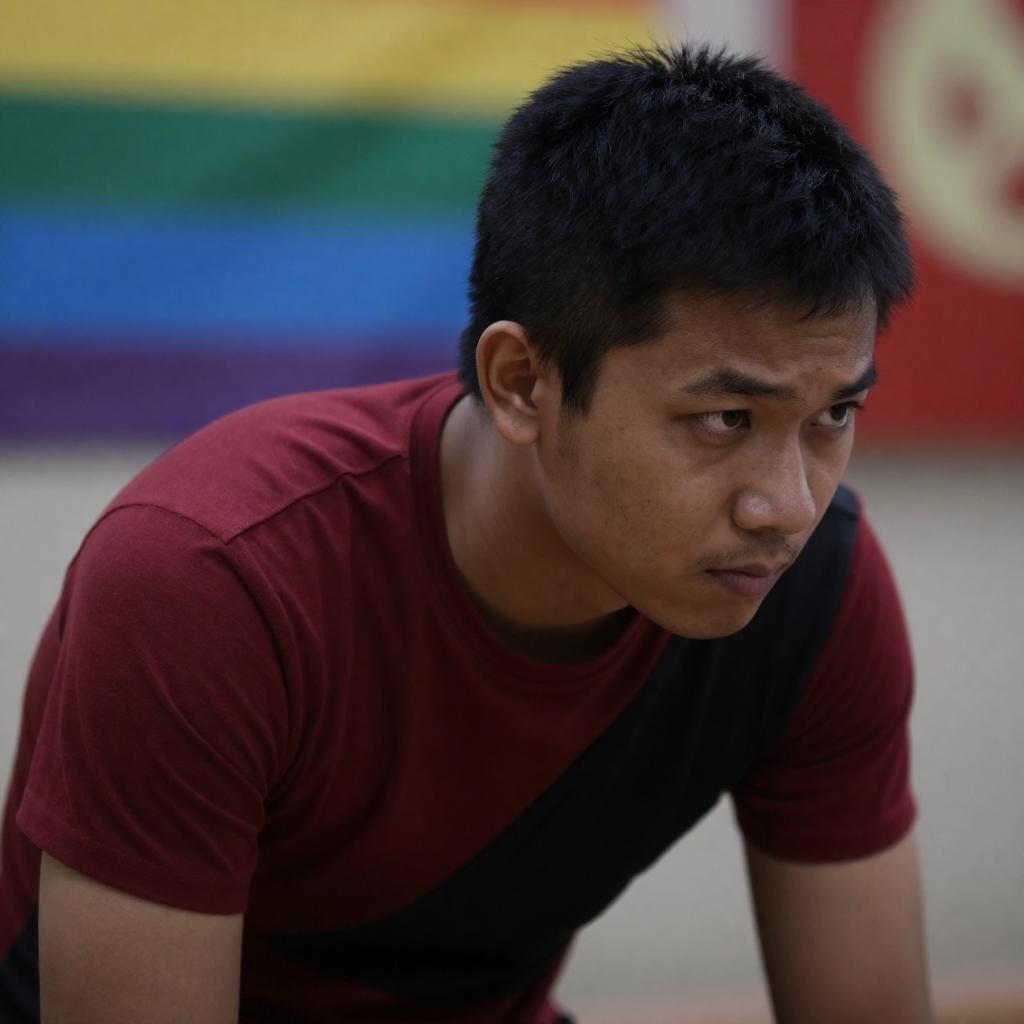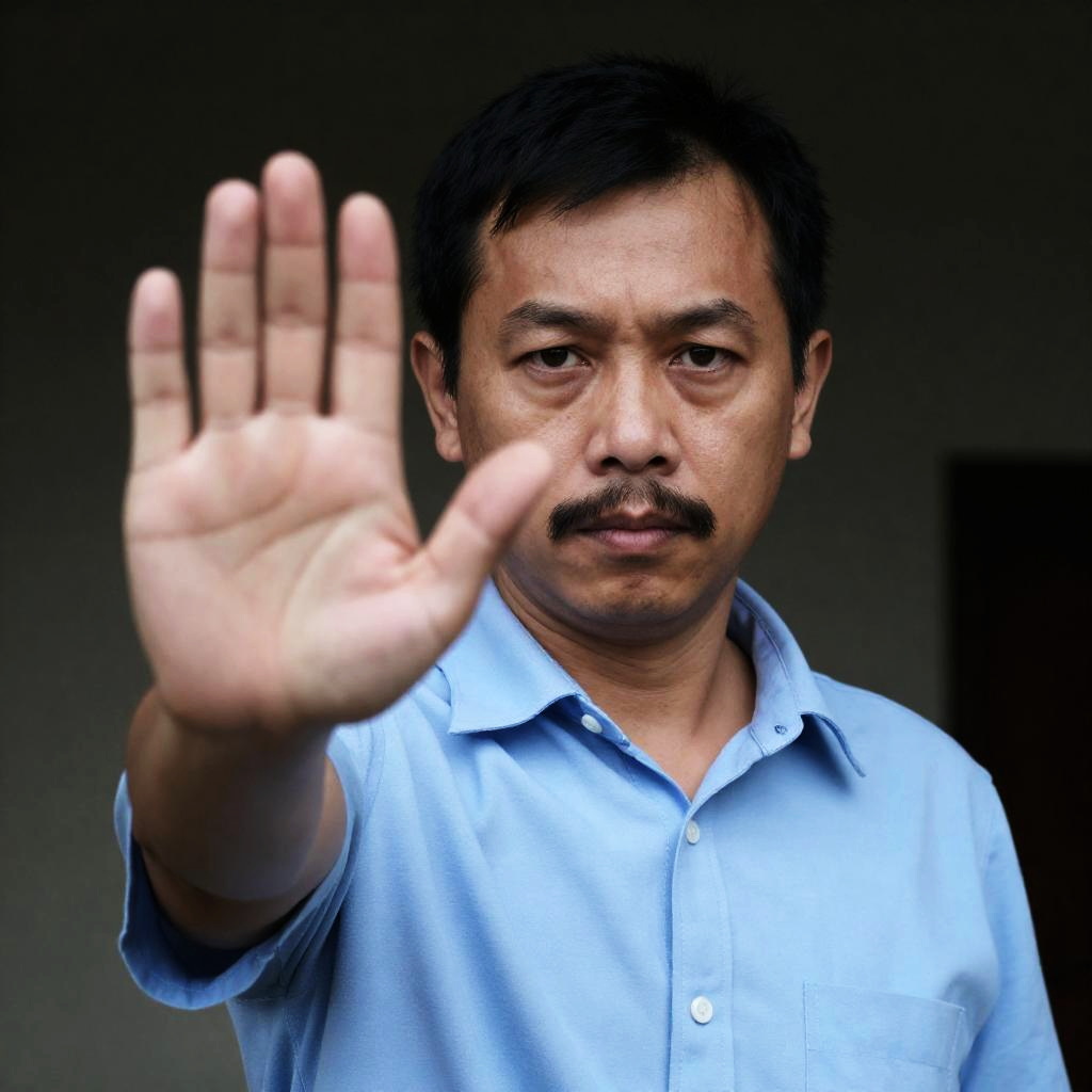Photograph of an Asian man with short black hair and a mustache, wearing a light blue shirt, raising his right hand in a stop gesture. Dark, blurry background with a dimly lit object on the right. Intense facial expression.