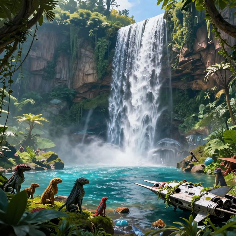 Star Wars jungle planet landscape with a colossal waterfall cascading into a crystal-clear lagoon, exotic creatures gathering around, starfighter wreckage partially covered in vines, vibrant and detailed environment