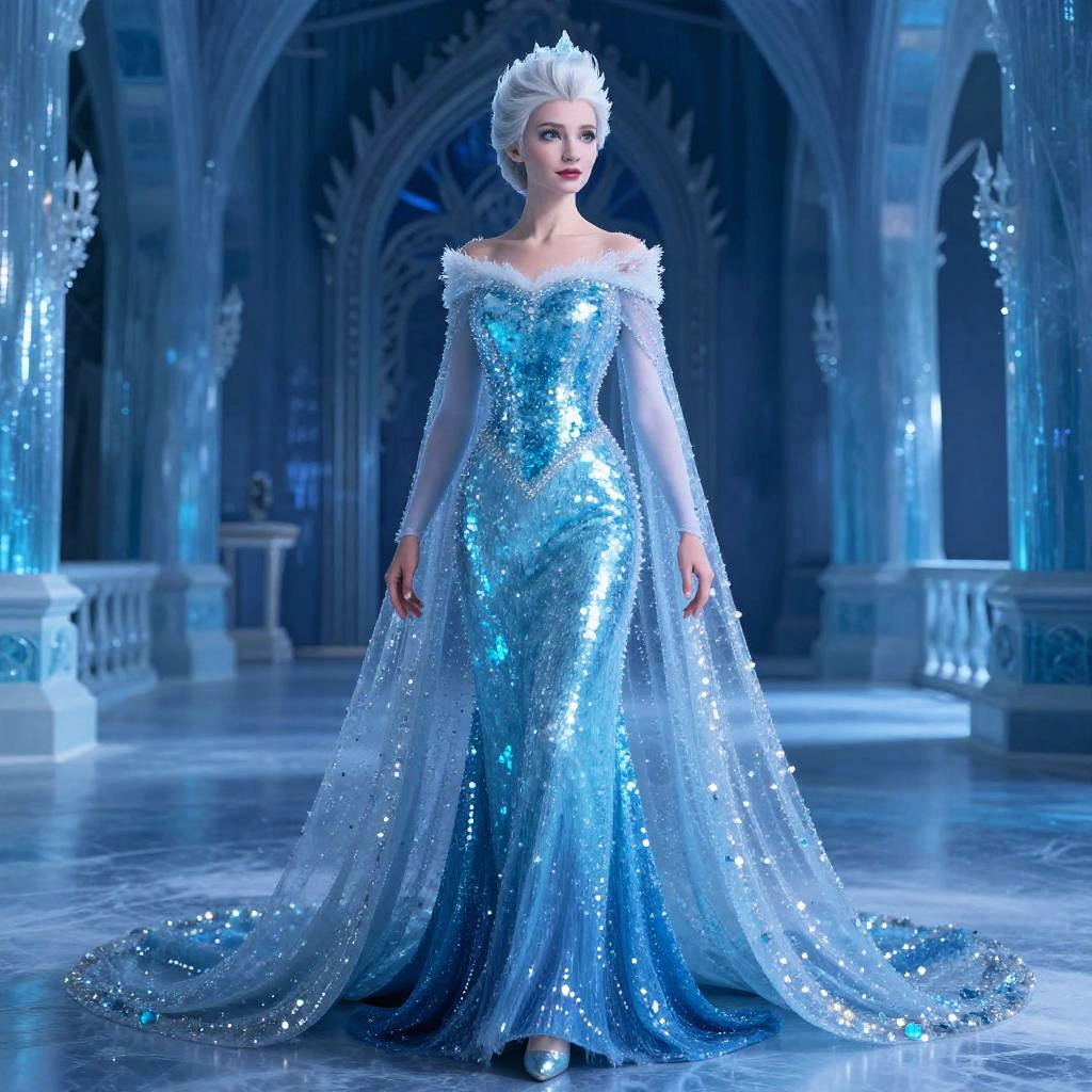 Masterpiece, gorgeous full body portrait of a elegant ice queen in icy blue sequin gown with crystal cape, stunning elegance, in frozen palace hallway, in the style of Shaun Tan, highly intricate, highly detailed, cinematic, hyperrealism, photorealism, vibrant colors, volumetric lighting, by Shaun Tan, retouched by Elena Dudina, photo taken by a Fujifilm GFX100S, 85mm lens, f/1.4 aperture, 1/500 shutter speed, ISO 400 film, UHD, HDH, HDR, 8k, 16k, 32k