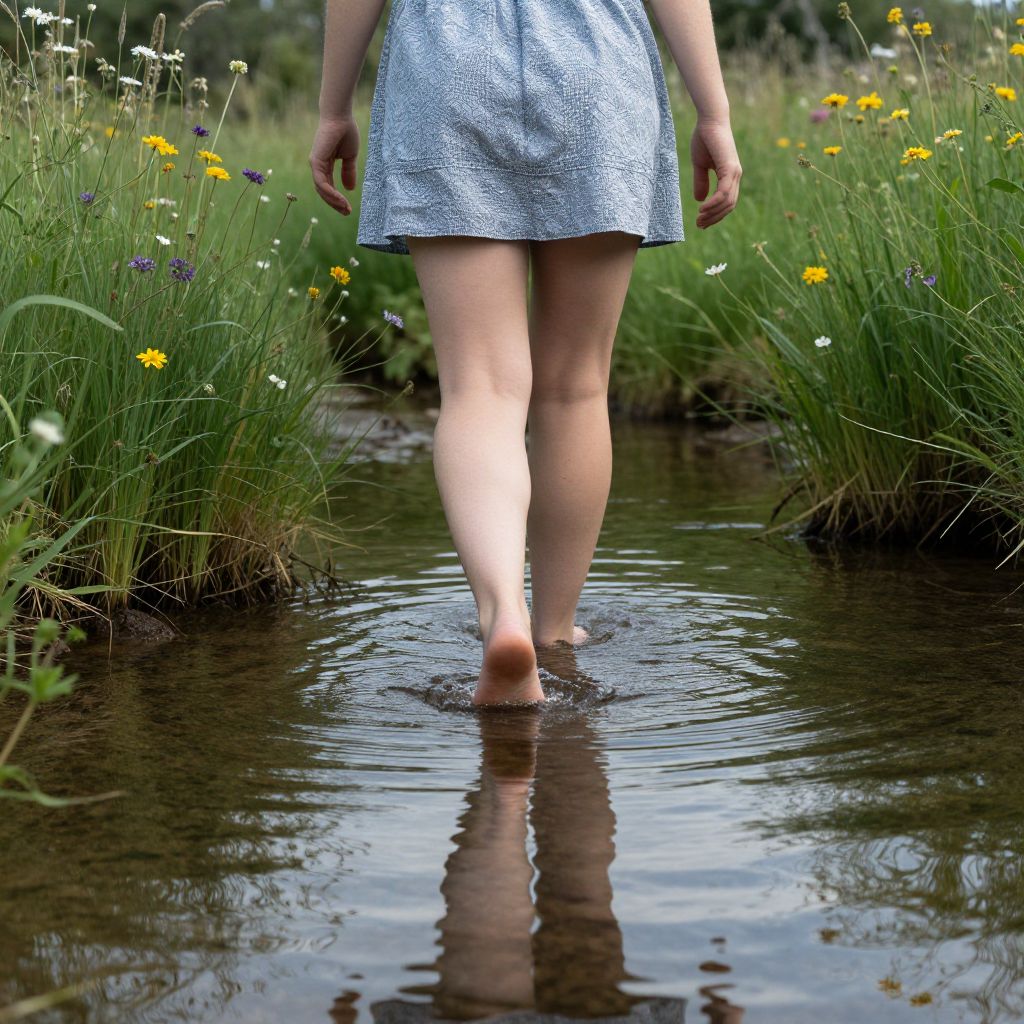 Woman walking barefoot through a tranquil creek, surrounded by lush greenery and wildflowers, her reflection shimmering in the calm water.