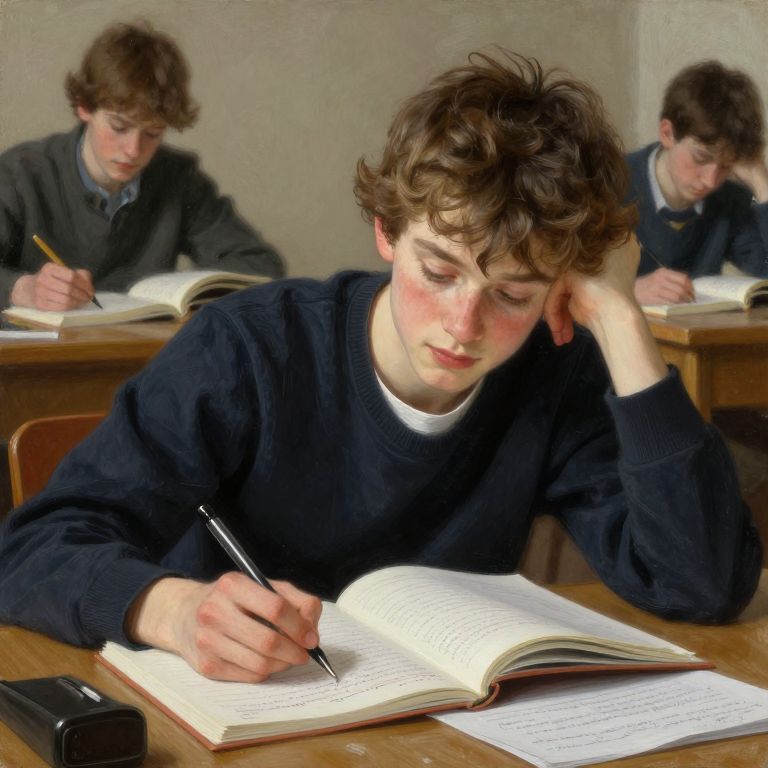 Photograph of three young Caucasian boys with messy brown hair in a classroom. The foreground boy, wearing a black sweater, leans on his hand, writing in an open notebook with a pencil. His expression is focused. In the background, two boys, also in black sweaters, similarly concentrate on their notebooks. The wooden desks and chairs are simple. The room has a neutral, light-colored wall. A black pencil case is on the desk in the foreground. The image has a slightly grainy texture.