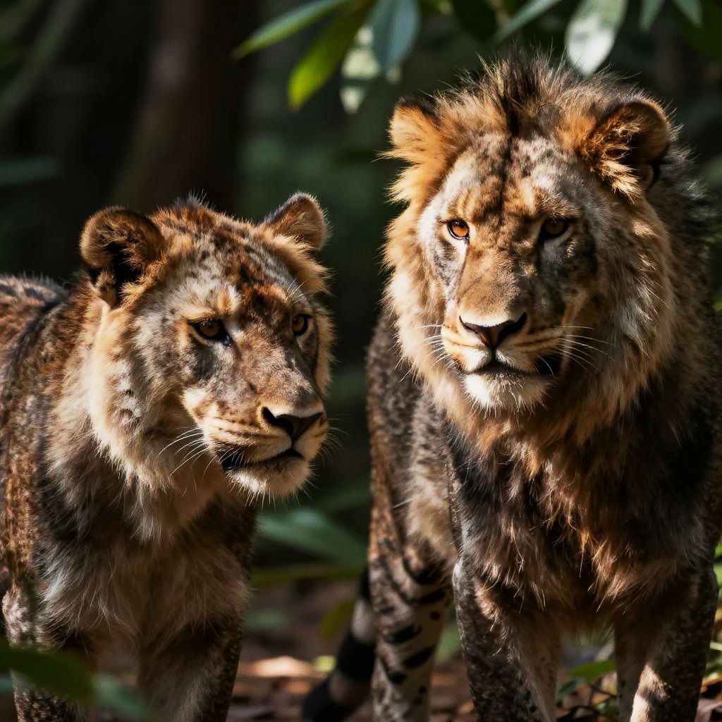 Realistic AI generated photos featuring close-up shots of wild animals in their natural habitats, with sharp focus on fur and feathers, realistic shadows, and ambient sunlight filtering through dense foliage to create depth and texture.