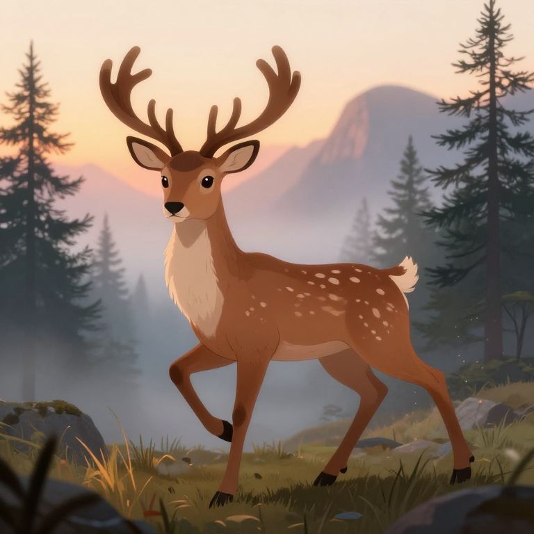 Digital illustration of a cute, brown deer with white spots and large antlers standing in a sunlit autumn forest, surrounded by colorful leaves and tall trees