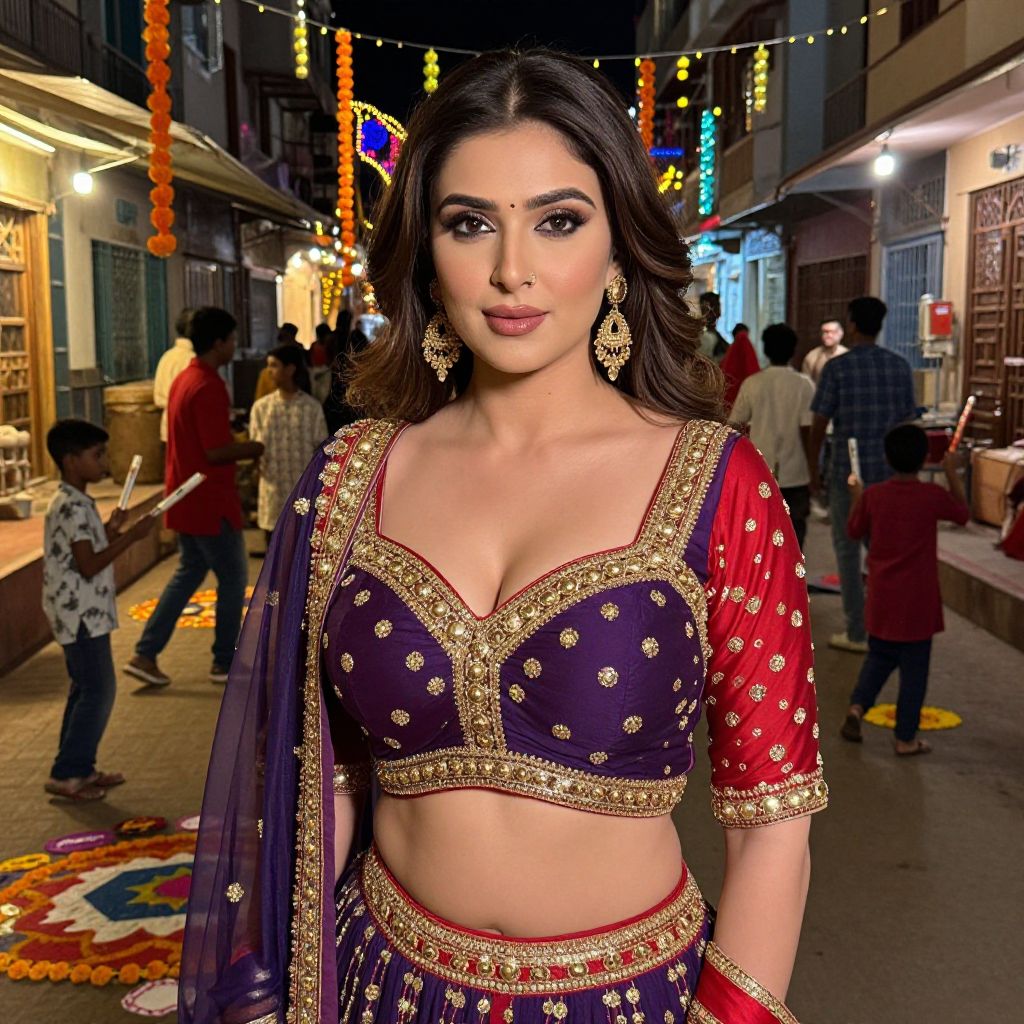 A beautiful woman in a royal Diwali outfit costume, wearing a rich purple and crimson choli with a heavy gold border and a matching lehenga, standing in a bustling neighborhood during night time; her face is elegant with subtle makeup, full brows, and a radiant gaze, surrounded by colorful lights, rangoli, and children playing with marigold sticks. The woman has big breasts and cute face