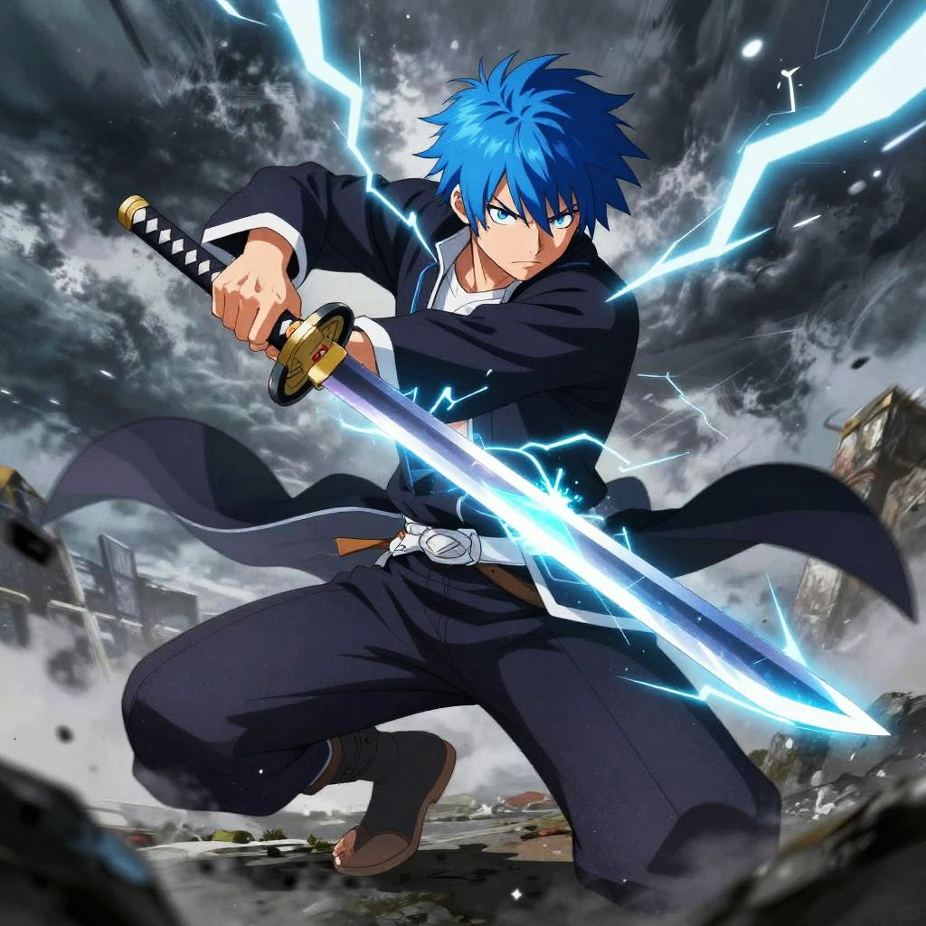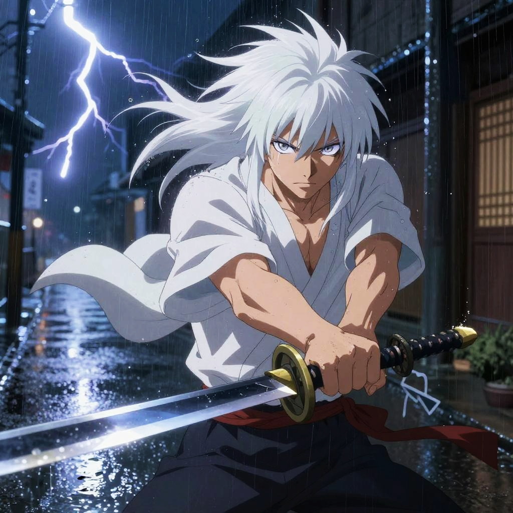 Dynamic action scene showing a black and white haired anime boy wielding a glowing katana, mid-leap in a bamboo forest, sharp shadows from moonlight filtering through leaves, detailed anime style with fluid motion and intense expression.
