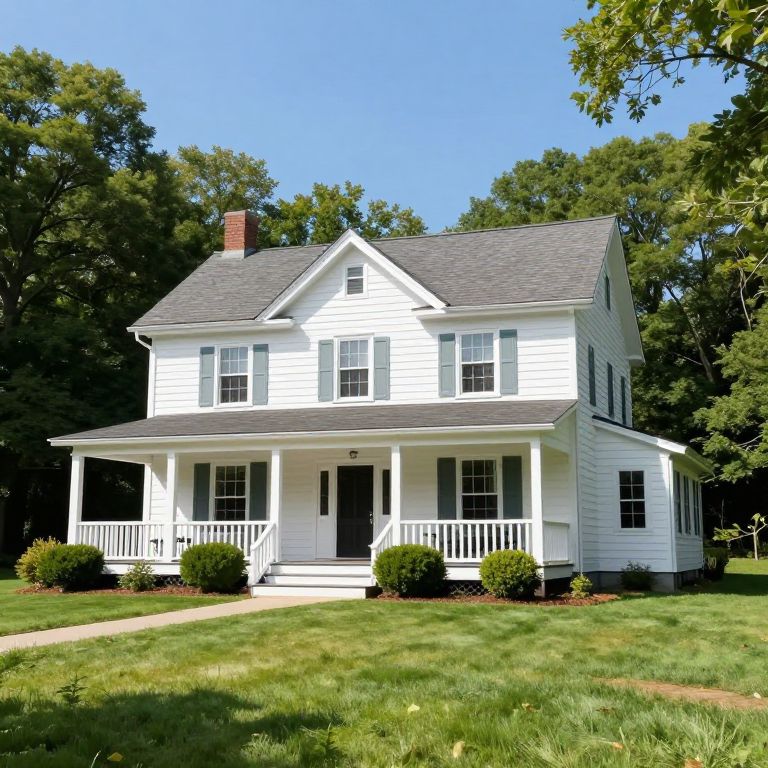 Maple Forest Bed and Breakfast showcases a charming two-story white farmhouse with a welcoming front porch, surrounded by lush greenery, manicured shrubs, and a well-maintained lawn under a bright blue sky.