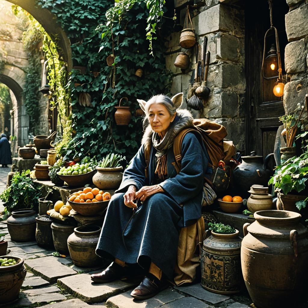 An elderly woman with large ears dressed in a long dark cloak and scarf, sitting against a stone wall covered in ivy in the early morning golden light. She carries a large, tall backpack filled with textiles, furs, and miscellaneous objects. Surrounding her are a variety of rustic pots and containers holding fruit, herbs, weapons, and wares, creating a mystical market atmosphere.