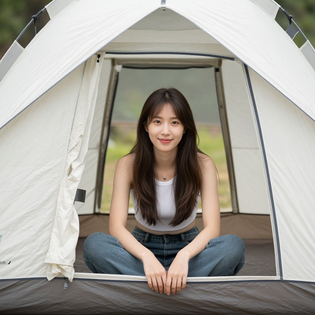 Young Asian woman with long black hair, smiling, sitting inside a white and black camping tent in a forest. Wearing black t-shirt and green pants