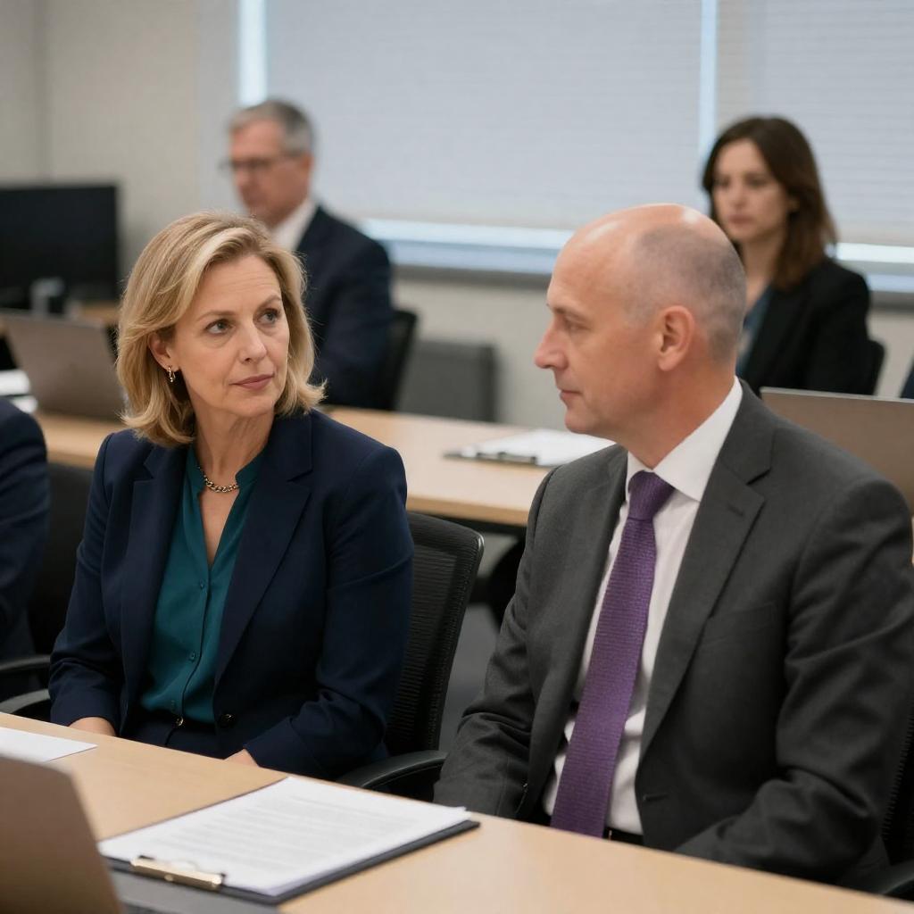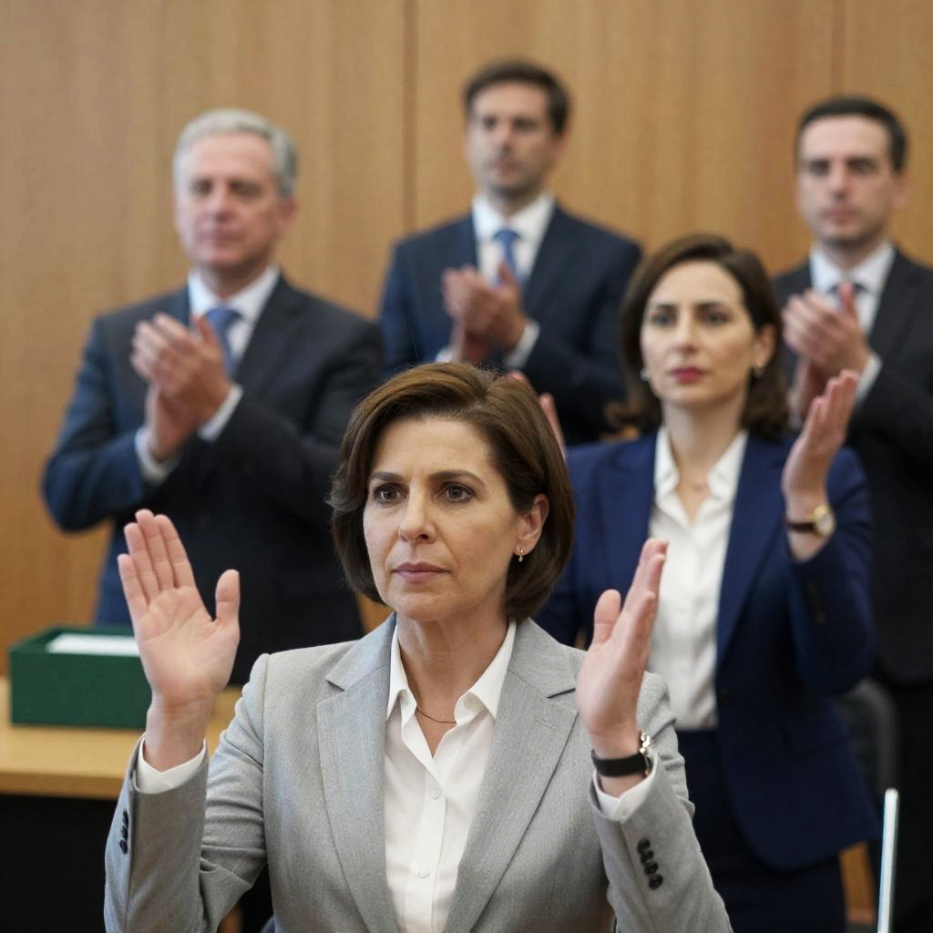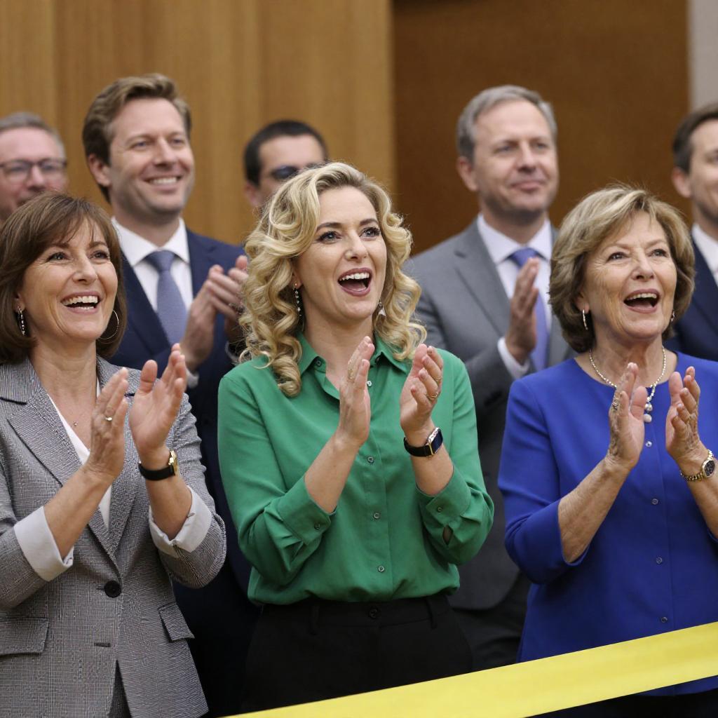 Photograph of a group of seven people standing closely together, clapping with excited expressions. Women in colorful blouses and one in a checkered suit. Men in suits. Background includes wooden structure. Yellow ribbon across bottom right. Intense facial expressions. Blonde, curly-haired woman in green blouse center. Man in grey suit right. Older woman in blue blouse right. Smiling man left. Mixed emotions of excitement and anticipation.