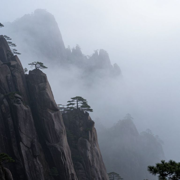 Montes enveloped in mist and low-hanging clouds during early morning, jagged stones jutting out from dense fog, mysterious and ethereal ambiance, pine silhouettes fading into the haze, capturing the mystique and raw beauty of high-altitude wilderness.