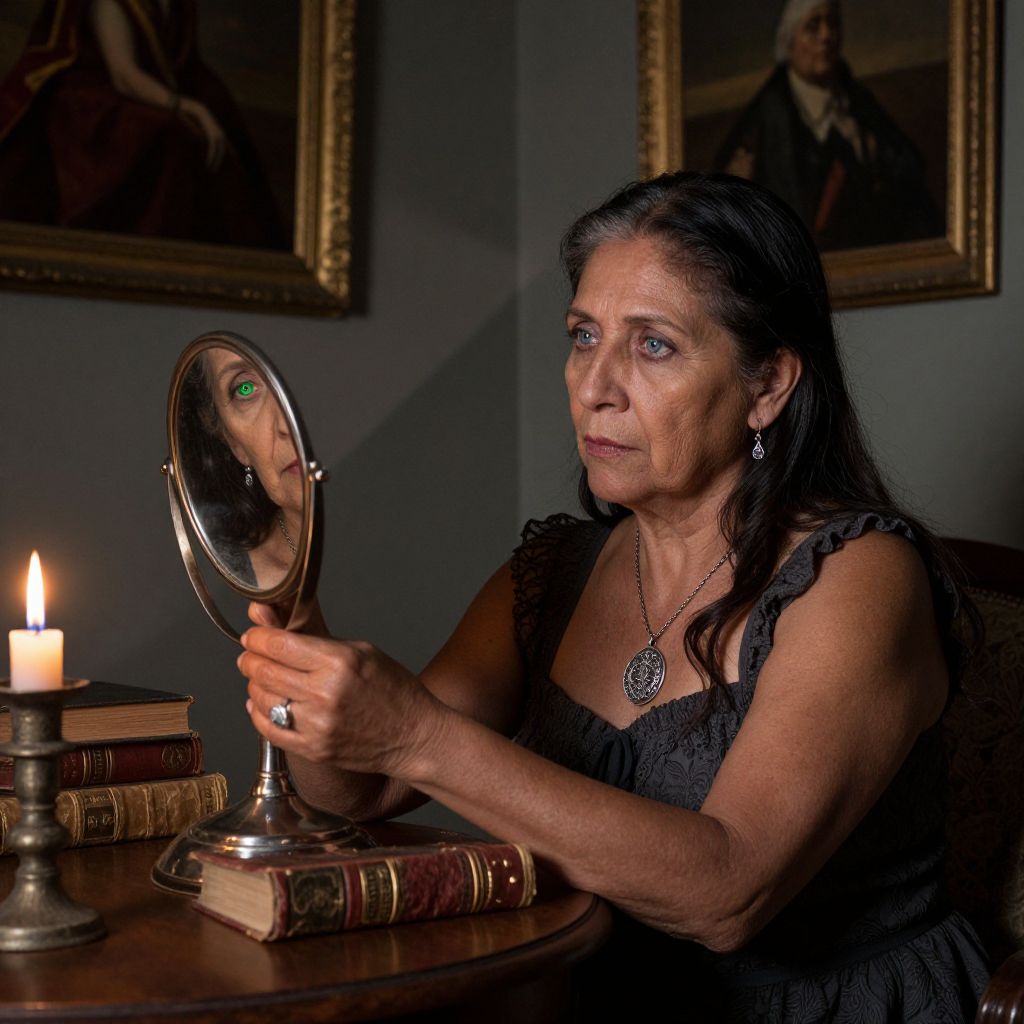 A somber middle-aged Latin American woman with compassionate blue eyes sits amidst antique books and paintings in a dimly lit room. Adorned with a delicate silver pendant, she gazes into her handheld mirror, where her reflection slowly transforms—revealing a wise old sage with vibrant green eyes. The soft candlelight from an old wooden table casts long shadows across the walls, stretching towards her. This enigmatic portrait captures a lifetime's wisdom etched upon her face, inviting viewers to ponder the untold stories hidden within this mysterious world of knowledge.