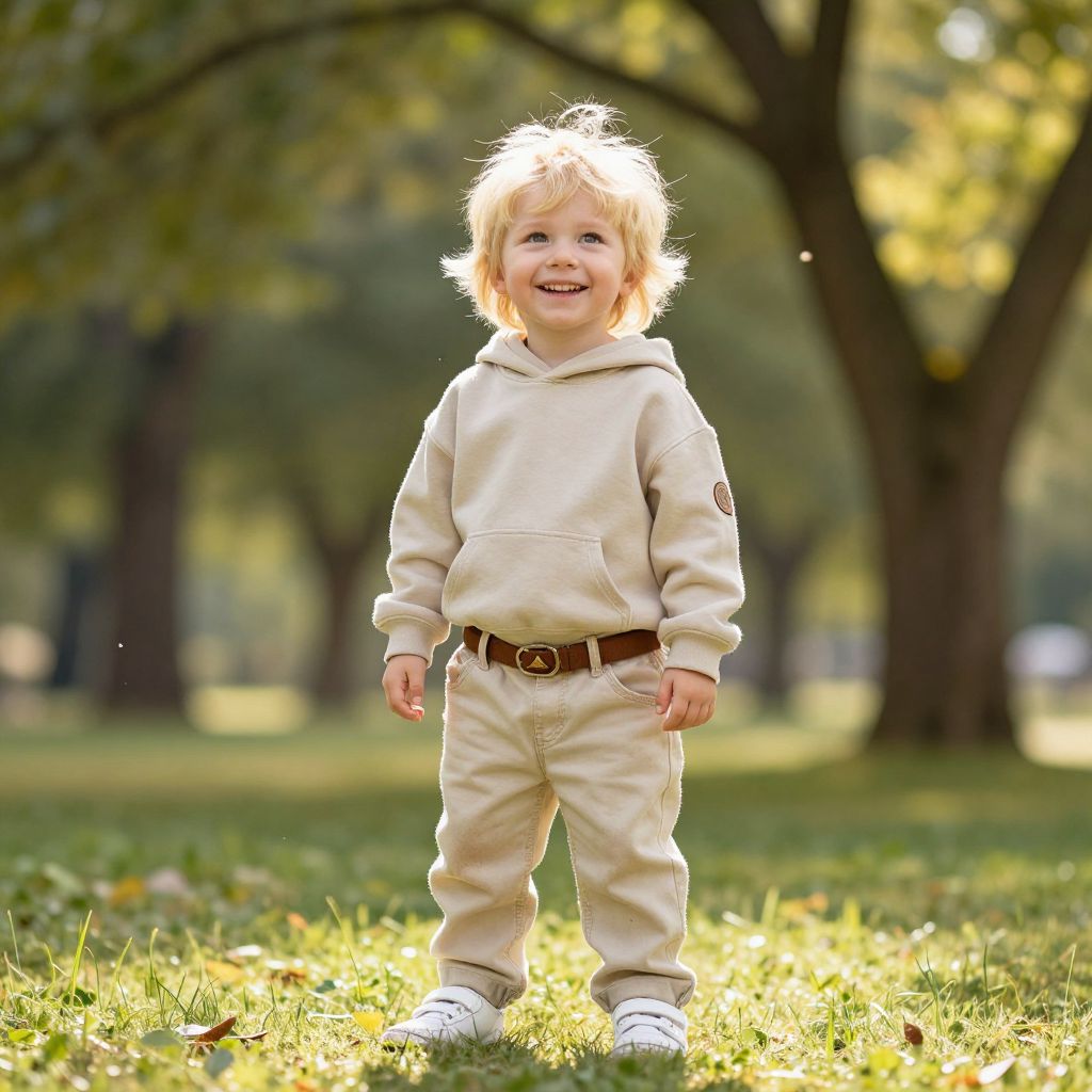 A young boy with vibrant blonde hair that shimmers in the sunlight, bright and energetic eyes full of curiosity, and a cheerful, wide smile that radiates innocence and playfulness, wearing a loose beige hoodie with a small patch on the sleeve, beige pants with a subtle fade at the knees, a brown belt adorned with a small, polished buckle, and white sneakers slightly scuffed from play, standing in a sunny park setting surrounded by lush green trees and soft golden sunlight filtering through the leaves. The scene exudes a sense of natural joy, calm energy, and childhood wonder, with a gentle breeze moving the leaves and the boy gazing toward the horizon with a look of pure happiness.