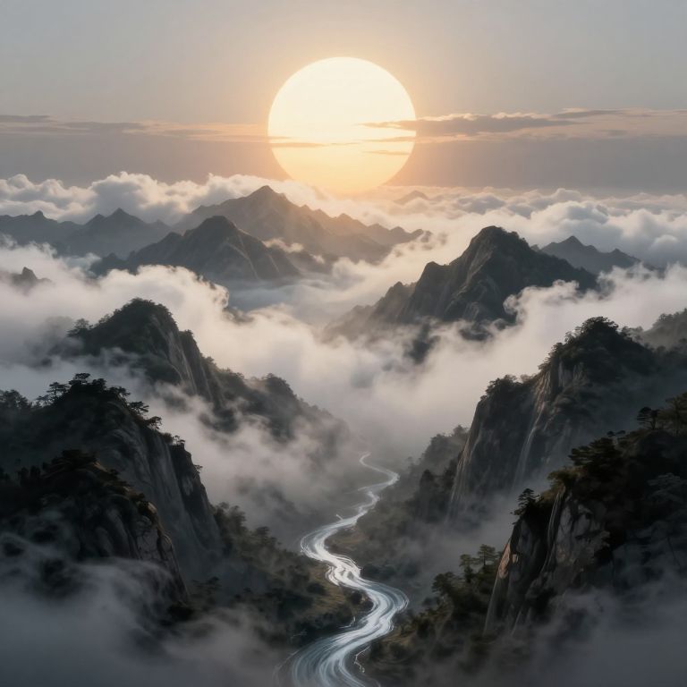 Photograph of a breathtaking mountainous landscape at sunrise. The sun, a bright golden orb, is partially obscured by clouds, casting a warm glow. Below, dark, jagged mountain peaks rise through a thick layer of mist and clouds. A winding, silver river snakes through the valley, reflecting the sunlight. The mountains are covered in sparse, dark green trees. The overall color palette includes warm yellows and oranges from the sun, cool whites and greys from the clouds and mist, and dark greens and browns from the mountains and trees. The scene evokes a sense of tranquility and awe.