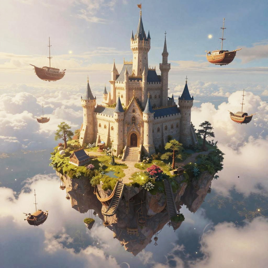 Fantastical digital artwork: Floating medieval castle with turrets, surrounded by fluffy clouds, and three wooden ships, with lush greenery and stairs.