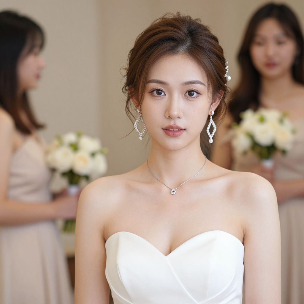 Photograph of a young Asian woman with fair skin and dark brown hair in an elegant updo, wearing a strapless white wedding dress with a sweetheart neckline. She has large, diamond-shaped earrings and a delicate necklace with a small pendant. Her expression is calm and slightly smiling. In the blurred background, two other Asian women with long dark hair are wearing beige dresses and holding bouquets of white flowers. The setting appears to be indoors with soft, natural lighting. The focus is on the bride, with the background figures slightly out of focus.