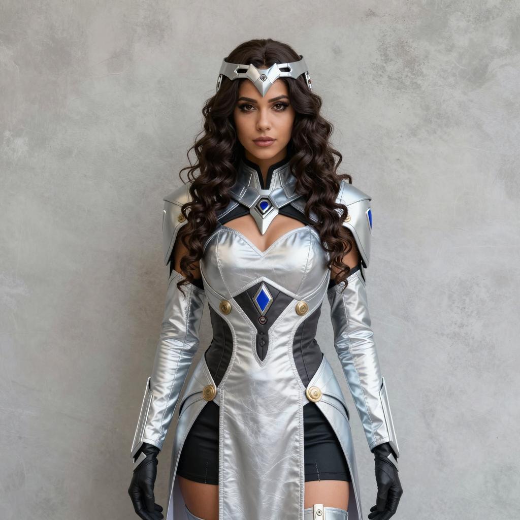 A woman dressed in a realistic Suletta Mercury cosplay costume stands confidently against a textured wall, her dark curly hair framed by a distinctive metallic headpiece. The costume features futuristic silver fabric with intricate detailing, capturing the sci-fi anime style with striking authenticity.