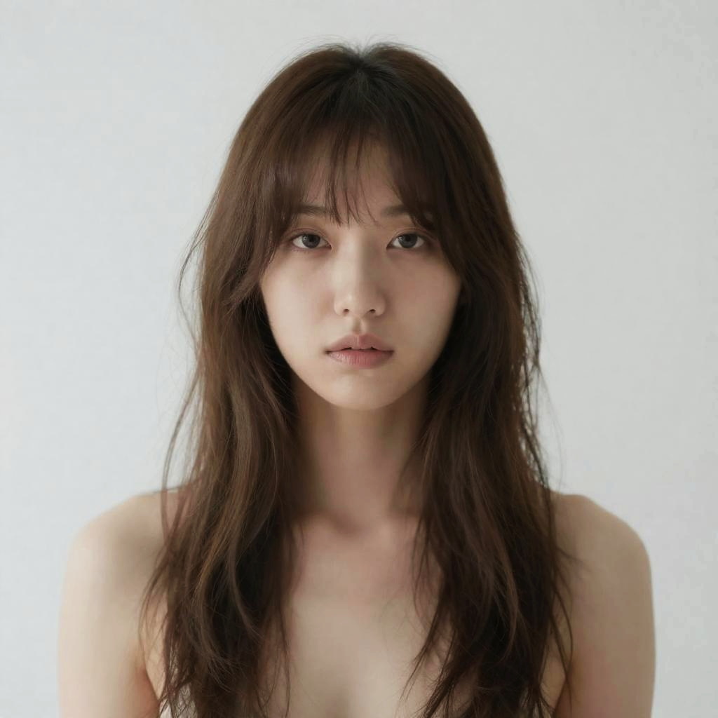 Photograph of a young woman with light skin and dark brown eyes, wearing a white towel wrapped around her head. Her dark brown hair is mostly covered, with a few strands visible. She has a neutral, slightly concerned expression. She is bare-shouldered, and the background is blurred and beige.