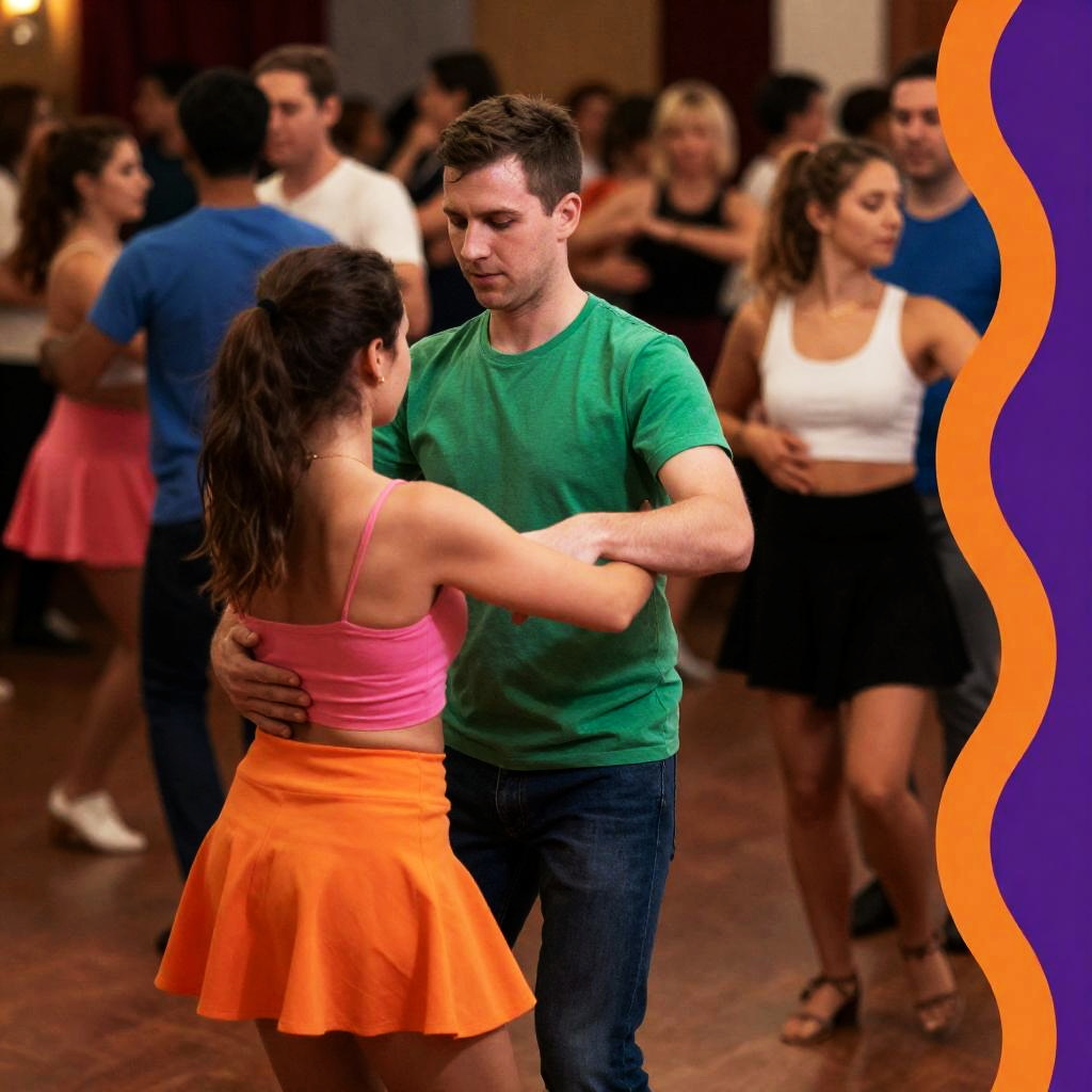 Photograph of a 42nd Street dance scene. Men in green and blue shirts, women in pink and orange short skirts and tops, dancing in a crowded ballroom. Central man looks down at woman with ponytail. Background: dark, blurred audience. Right: woman in white top, black skirt, holding another dancer's arm. Orange and purple wave-like border on the right.