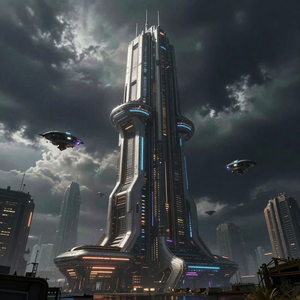 Sci fi building concept art, towering futuristic skyscraper with glowing neon lights, intricate metallic structures, hovering drones around, dark stormy sky backdrop, ultra-detailed, cinematic lighting, high-tech urban environment, cyberpunk aesthetic