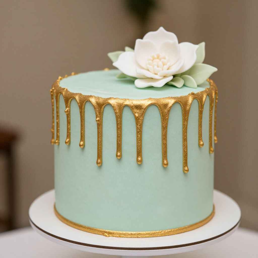 Elegant mint green cake adorned with a cascading gold leaf drip and a delicate white sugar flower atop, showcasing a sophisticated and glamorous design perfect for a wedding celebration.
