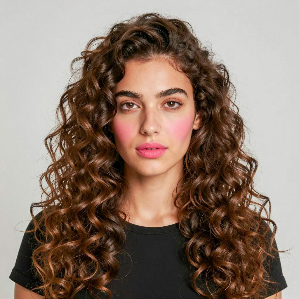 Photograph of a young woman with curly brown hair with blonde highlights, medium skin tone, brown eyes, and pink lipstick. She wears a white top and gold necklaces. Her expression is neutral, slightly smiling. Background is blurred and beige. She is centered in the frame, facing the camera.