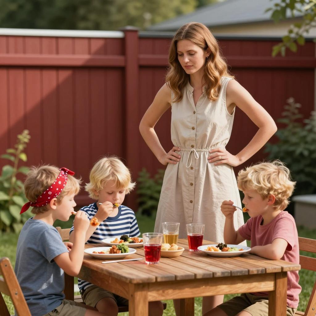 A family picnic. Five people around a wooden table. Woman with long blonde hair, beige dress, facing away. Man with long brown hair, beard, headband, wearing a dark tank top, leaning forward. Two blonde children, one eating a sandwich, one looking down. Young girl in red plaid shirt and floral pants, sitting on bench, eating. Red can on table. Grill with smoke in background. Wooden fence and greenery in background. Sunlight filtering through trees.