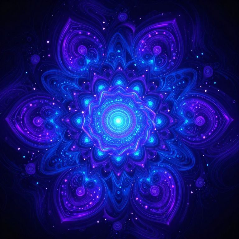 Digital art of a glowing, intricate blue and purple mandala with swirling patterns, bright central light, and small sparkling dots against a dark background.