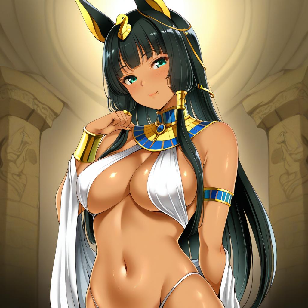 Anubis (mythology), egyptian mythology, 1girl, dark-skinned female, jackal ears, black hair, long hair, navel, by artist murabito c, illustrious