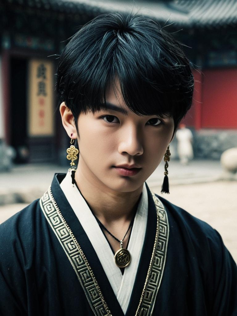 Young man in traditional Korean and Chinese attire with hat
