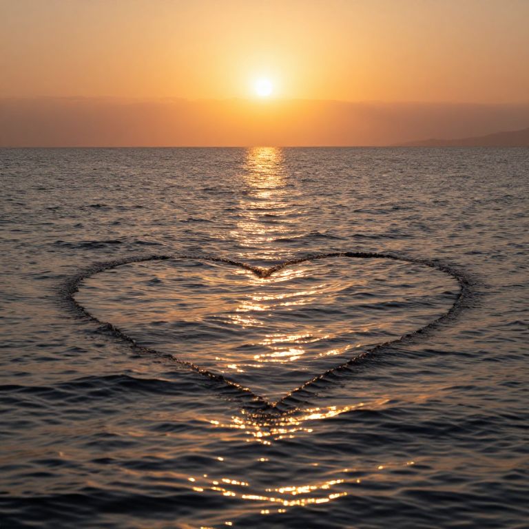 A heart-shaped reflection in shimmering ocean water at sunset, with the sun glowing in the distance.