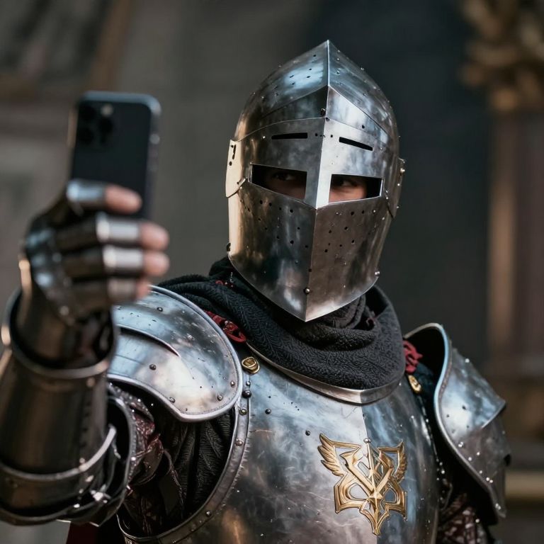 A realistic picture of a knight in full medieval armor sitting against a castle wall holding a cardboard sign that reads \"Lost my job, please donate some buzz, please!\" It is wet and miserable outside, and the mood is depressing, Medieval townsfolk walk past the knight as he sits there begging for buzz