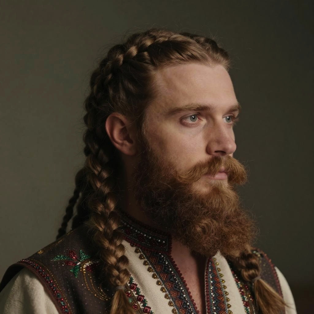 Dynamic close-up of Russian beard styles featuring elaborate braiding and natural curls, traditional Russian attire, soft cinematic lighting, highly detailed portrait