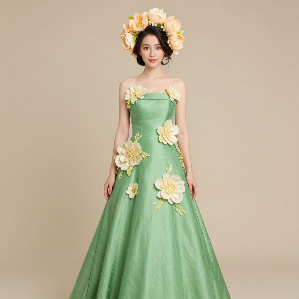 Photograph of a fair-skinned woman with dark, curly hair wearing a strapless, green, full-length gown adorned with large, yellow floral appliqués. She has a yellow floral crown matching the dress. The gown is made of a silky, flowing fabric, and the background is a plain, light beige. Her expression is neutral, and she stands with her hands by her sides. The overall style is elegant and whimsical, reminiscent of fairytale or fantasy fashion.
