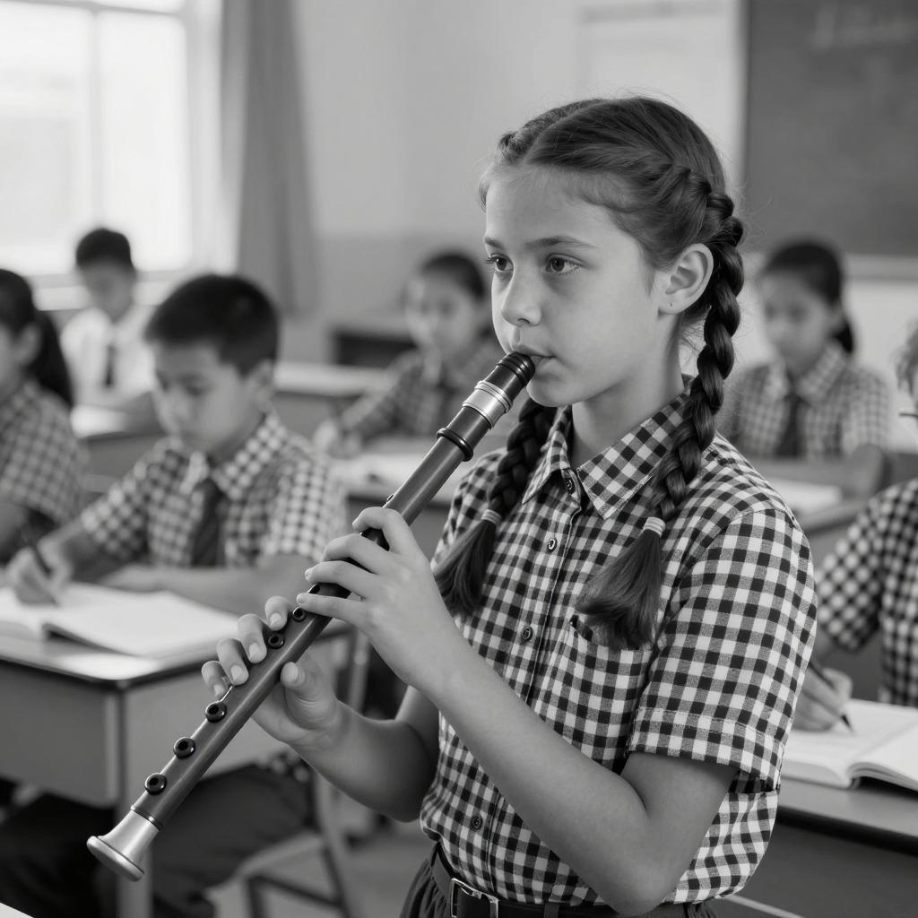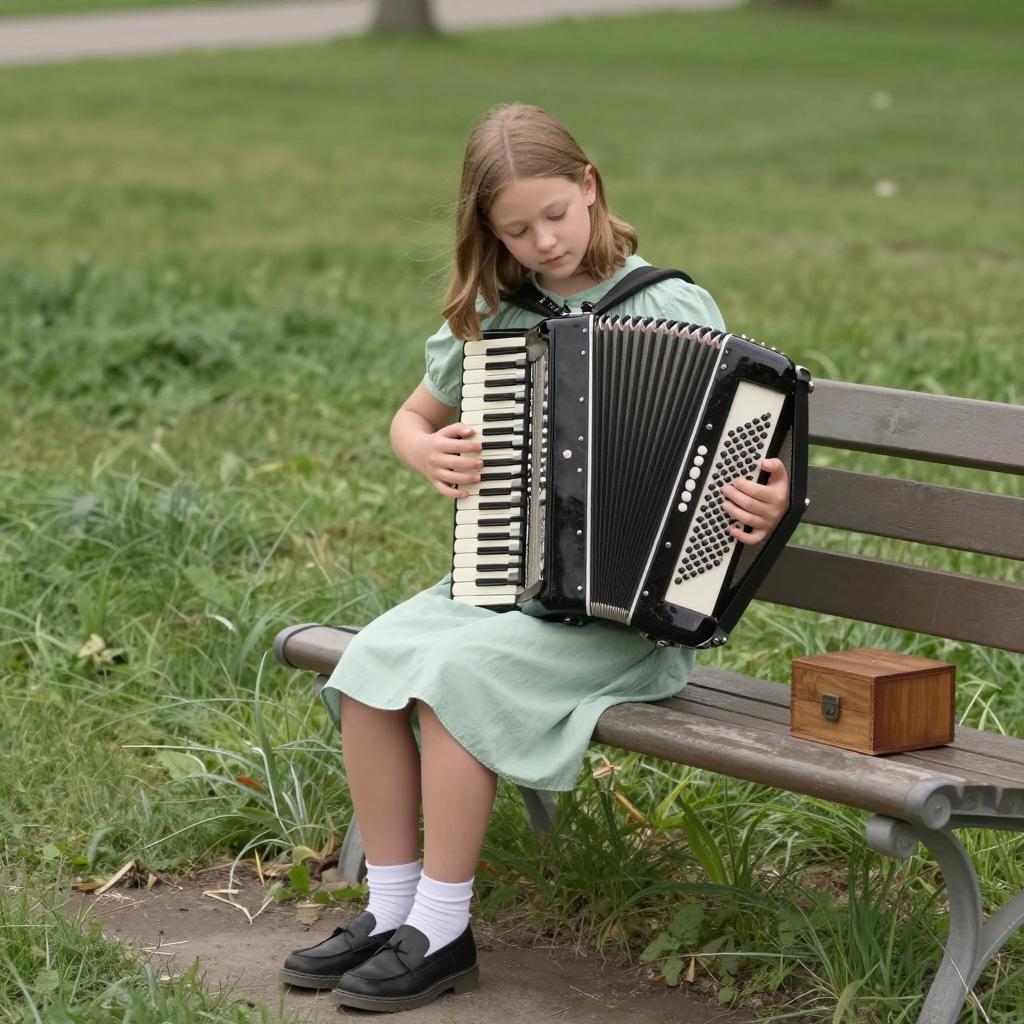 Girl with light brown hair, wearing a light green dress, white socks, and black shoes, sits on a wireframe bench in a grassy park. She plays a small black accordion, looking down. Bench is to the right, with a small wooden box on it. Green grass surrounds her. Daytime, natural light.