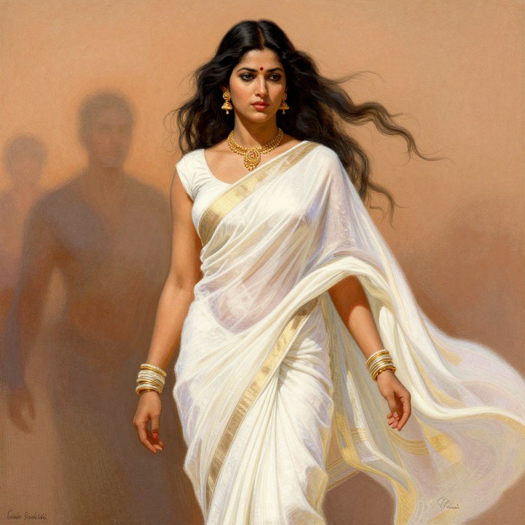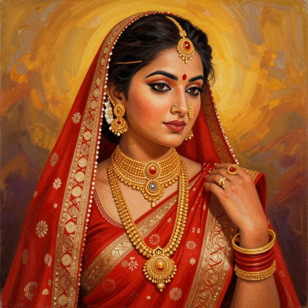 A vibrant Indian painting showcases a woman adorned in traditional attire, featuring intricate gold jewelry and a richly patterned red sari, rendered with detailed brushwork and warm, golden lighting effects that highlight her serene expression and cultural elegance.