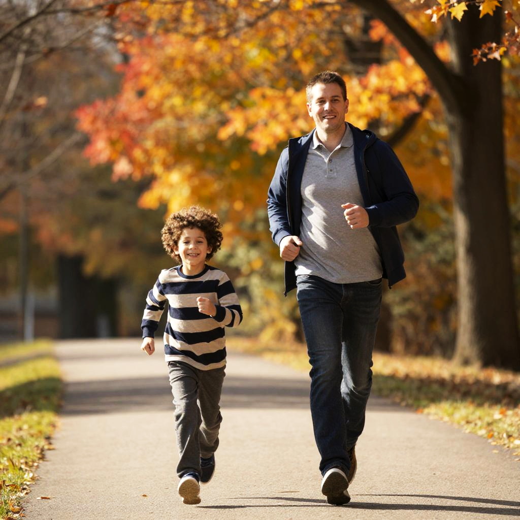 Man and young girl sitting in wooden sled, snow-covered ground. Man in black jacket, black gloves, brown hair. Girl in red patterned jacket, gray hat, white mittens, smiling. Sled with blue sides, wooden frame, red roof. Man leans forward, looking at girl, who leans back, smiling. Winter playground background.