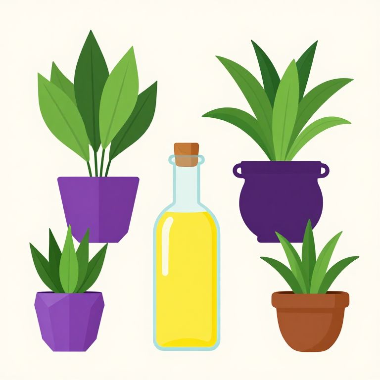 The image features a collection of 2D pot assets with a plain background, showcasing a variety of shapes, colors, and textures. There are three distinct pots, each with unique designs and contents. The first pot, located on the left, is a vibrant purple with a geometric, faceted base and a tall, slender neck. It contains a lush green plant with large, elongated leaves. The second pot, in the center, is a transparent glass bottle filled with a bright yellow liquid, topped with a cork stopper. The third pot, on the right, is a dark purple with a rounded base and a handle, holding a similar green plant. Additionally, there are two smaller pots, one purple and one brown, placed in the foreground, each containing a green plant with long, slender leaves. The overall composition is balanced, with the pots arranged in a triangular formation, creating a sense of harmony and visual interest.