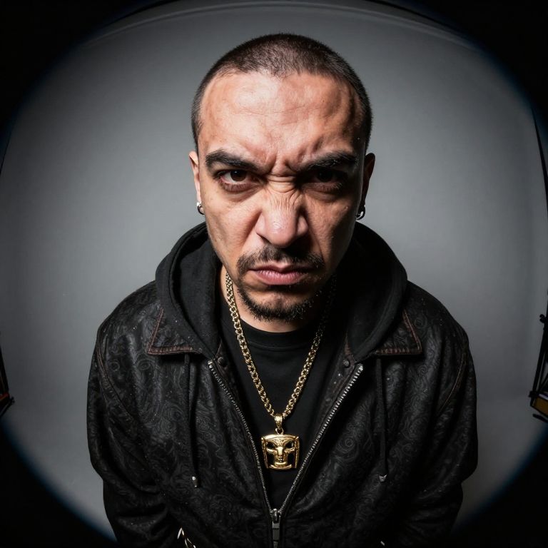 Hyper-realistic portrait of an angry gangsta rapper with a furrowed brow wearing a black patterned jacket, black hoodie, and a large gold chain with a pendant, captured using a fisheye wide-angle lens against a gray background.